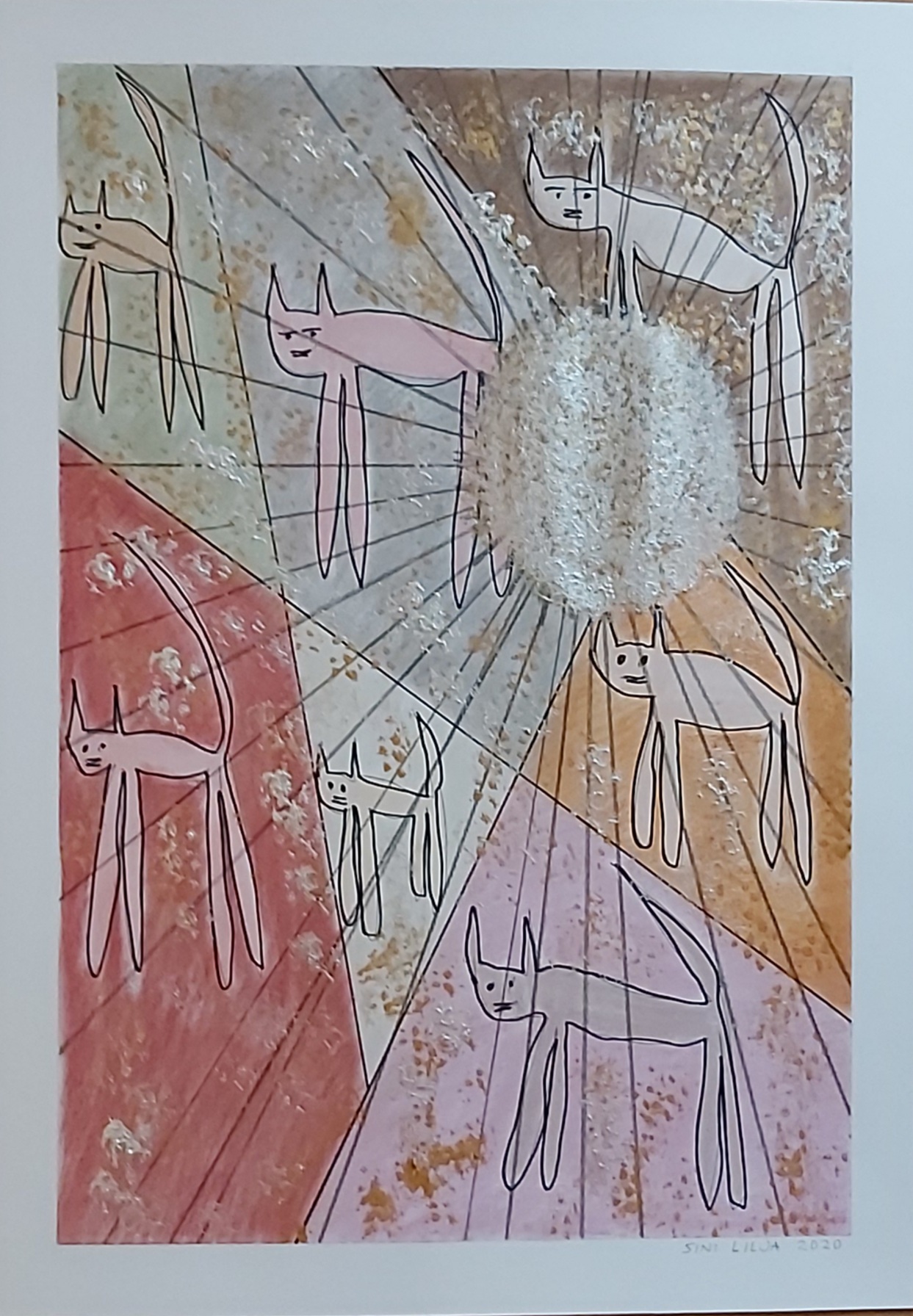 Tulee voimakas mielleyhtymä egyptiläisiin hautamaalauksiin. Sivusta kuvatut hahmot, vaikka tässä kissoja, väritys ja siinä on selvästi Ra, auringon jumala luomassa säteitään. Kiehtova maalaus, tykkään paljon