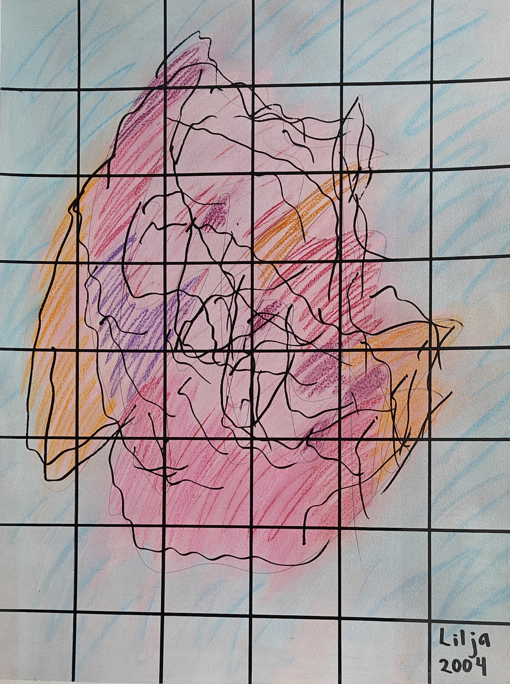 Teos voisi kertoa myös sisäisestä tutkimusmatkasta—siitä, miten yksilö navigoi omaa sisäistä maailmaansa. Ehkä ruudukko edustaa menneitä haasteita tai pysyvää rakennetta, kun taas värit ja muodot symboloivat löytöjä, intohimoa ja kasvua. Allekirjoituksesi ”Lilja 2004” viittaa aikaan, joka on sinulle erityisen merkityksellinen.