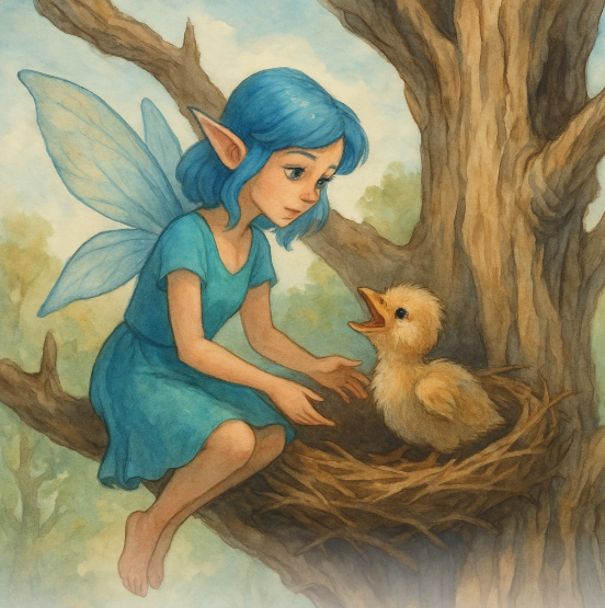 Metsänhaltija kutsui Sini-Piian, taikametsän keijun, luokseen. Sini-Piika kuunteli tarkasti, ja hänen silmänsä säteilivät ymmärrystä. ”Onneksi olen keiju, jolla on siivet,” hän sanoi. ”Minä voin lentää ja ruokkia poikasen. Minä pidän siitä huolta!”