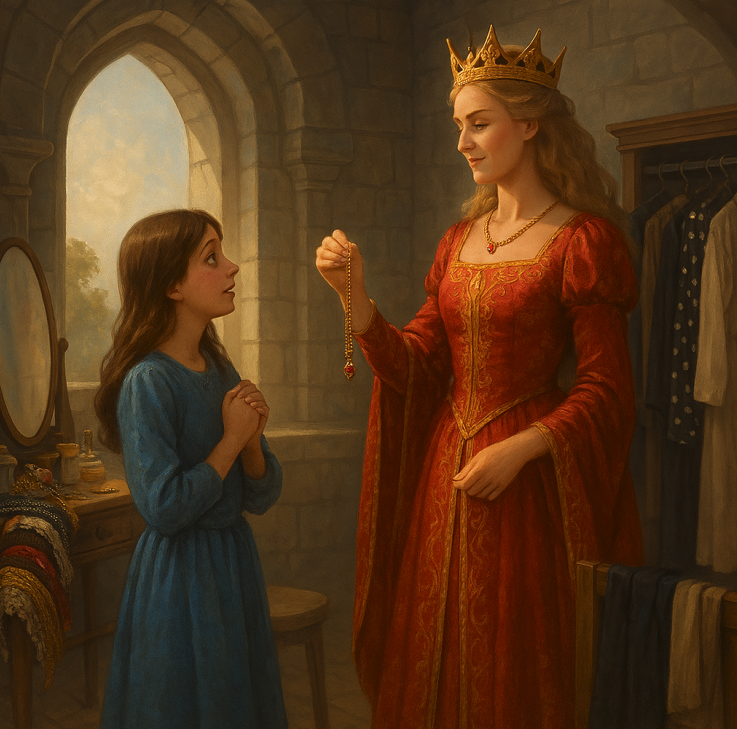 Hän ei puhunut pitkään. Vain sen verran, kuin kuiskaus kestää metsän latvassa. Mutta jokainen sana värähti salin kivissä, jokaisessa ikkunan kaarella, ja lopulta… Kuningattaren silmäkulmassa kimalsi pieni helmi – ei koru, vaan kyynel.