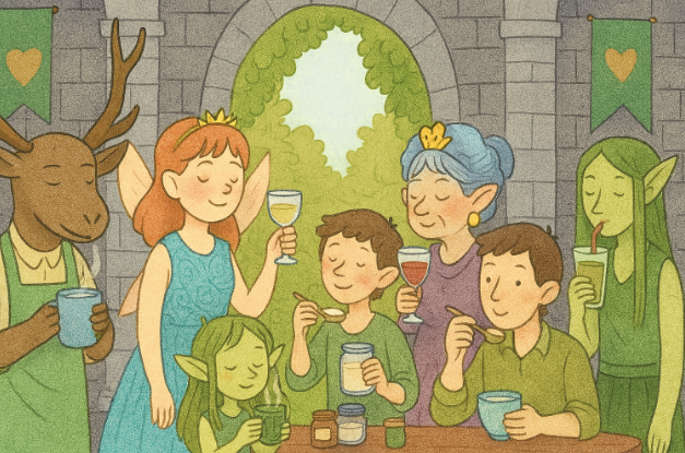 Vanhan Linnan sali oli täynnä pehmeää valoa. Kristallit heijastivat kynttilöiden liekkejä kiviseinille, ja vihreät viirit hulmahtelivat hiljaisessa ilmavirrassa. Pöydän ääressä istuivat Taikametsän olennot — jokaisella edessään oma kuitujuoma, höyryävä, hohtava tai hiljaisesti pulppuava.