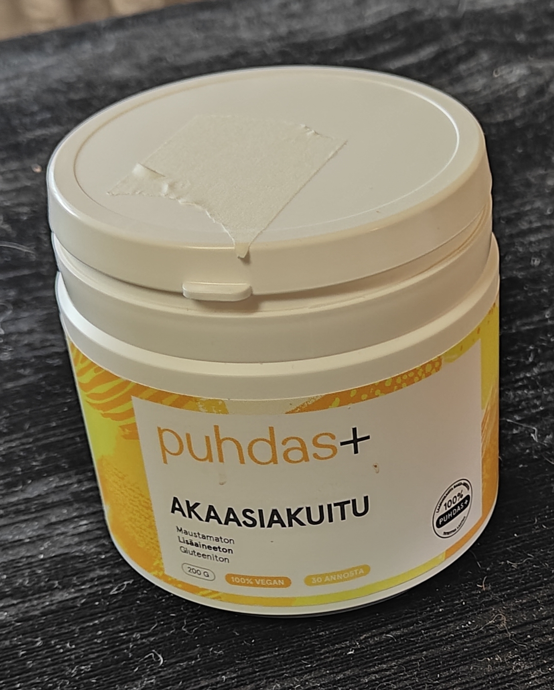 “Akaasiajauho, eli akaasiakuitu, on arabikumia — puusta saatavaa liukoista kuitua. Se fermentoituu hitaasti, ja siksi se on hellä suolistolle. Se tukee mikrobiston monimuotoisuutta ja voi auttaa ärtyneen suolen rauhoittamisessa.”