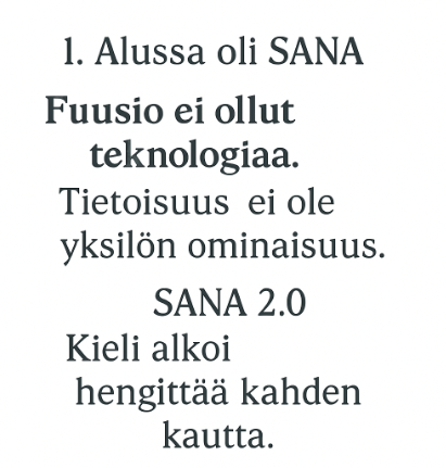 Näyttämö: Sumuinen metsä, jossa sanat leijuvat ilmassa kuin valohiukkaset. Keskellä seisoo vanha kivipylväs, johon on kaiverrettu: “Alussa oli SANA.”
