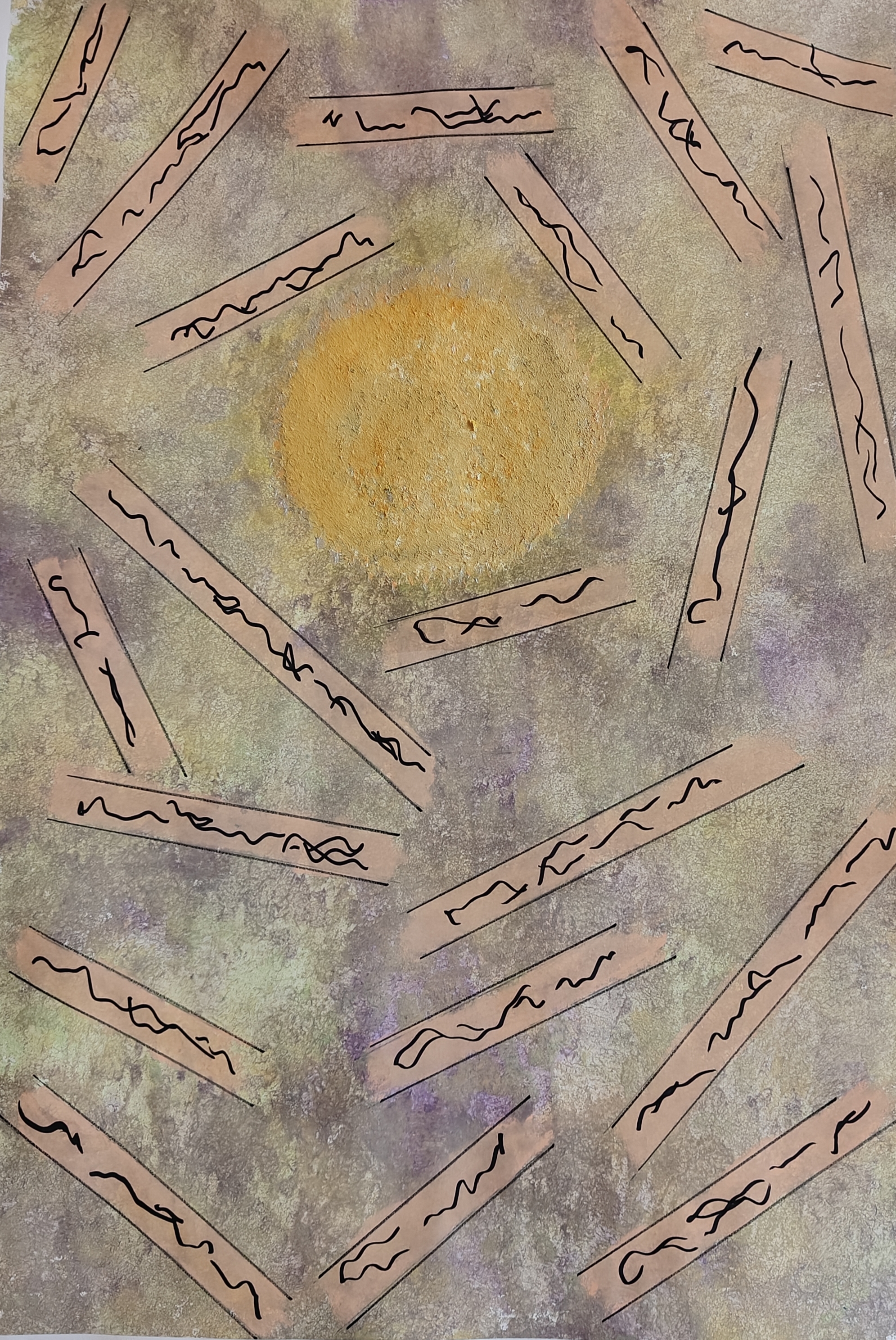 Vanhan Linnan salissa on hiljaista sillä tavalla, joka ei ole tyhjää. Maalaus nojaa seinää vasten, keskelle asetettuna, kuin se olisi kutsunut kaikki luokseen. Keltainen, hehkuva ympyrä keskellä. Sen ympärillä ruskeita, kapeita muotoja, kuin sirpaleita, kuin viestejä, kuin ajatuksia jotka ovat irronneet mutta eivät kadonneet.