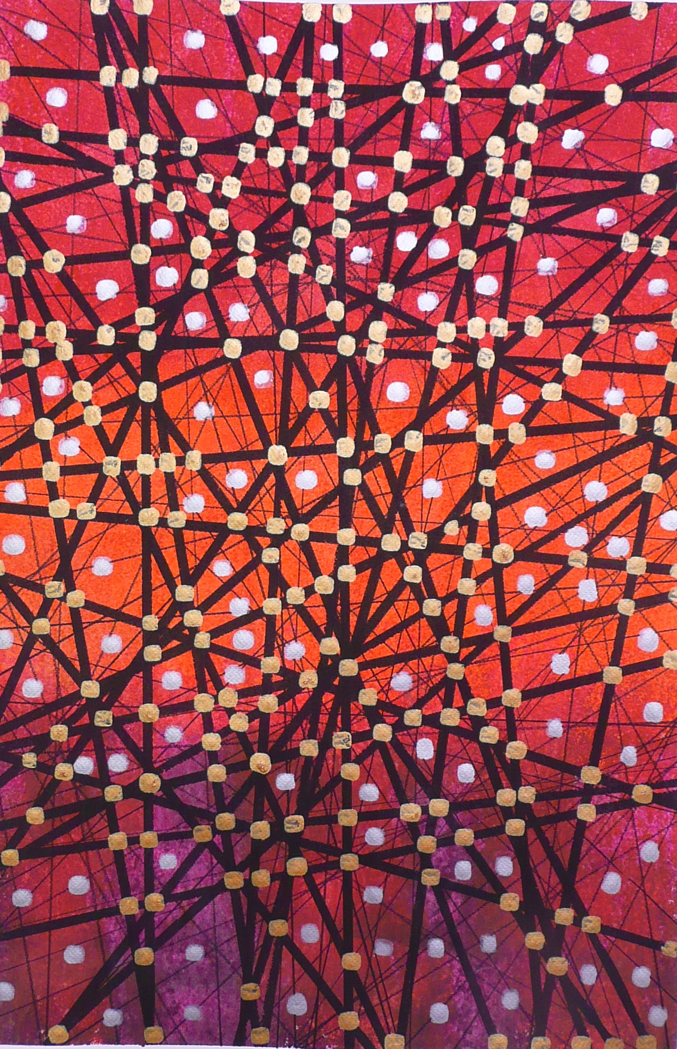 - Kultaiset Sydänpisteet: Teoksen lumovoima on noissa säännöllisissä, hohtavissa kultaisissa ja valkoisissa pisteissä. Ne ovat kuin pieniä majakoita tai sydämiä, jotka on asetettu verkon solmukohtiin. Ne kertovat siitä, että jokainen kohtaaminen ja jokainen viesti voi kantaa mukanaan valoa ja rakkautta.